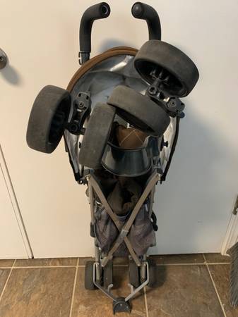 Can stand on its own which is a rarity for travel strollers. This stroller sunshade has some sunfading and the buckle is missing (you can order a whole new seat with buckle for only $8 if you care to fix this) or use it as is.