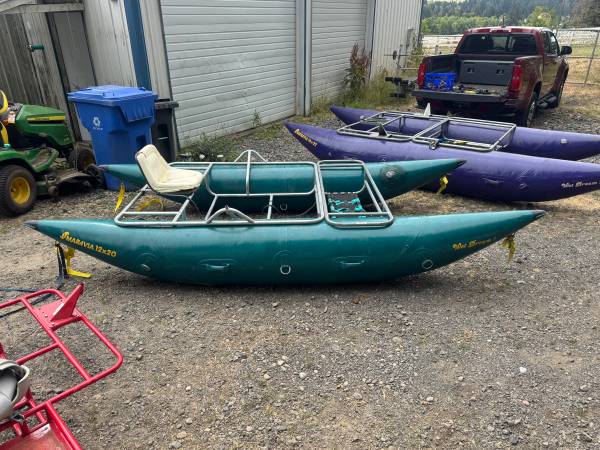 Green Maravia 12X20 cataraft. Yellow rowing frame or unpainted rowing frame & luggage frame. Green & black webbing on luggage frame in poor condition. Tubes in decent shape & hold air.