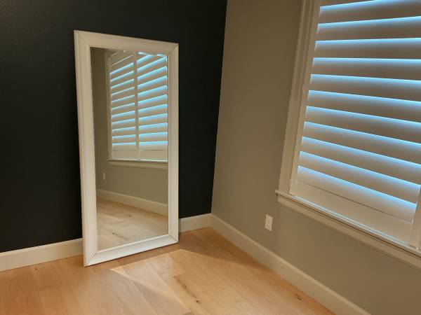 A floor length mirror with a white wooden frame in excellent condition. This mirror is set up to be hung vertically or horizontally. Length 64 inches Width 30.5 inches Asking $40