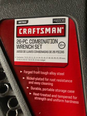 Craftsman 26 piece wrench set. Raised Panel design. Model 46936 Contents, 7, 8, 9, 10, 11, 12, 13, 14, 15, 16, 17, 18, 19, 20, 21, 22 mm. Mini-sizes midget 4, 4.5, 5, 5.5, 6, 7, 8, 9, 10, 11.