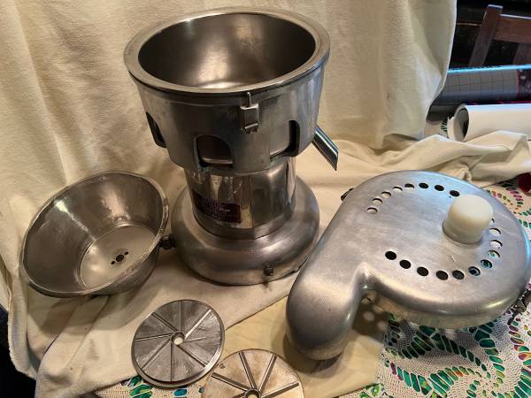 Ruby Manufacturing Nutrifaster Model 3 Commercial Vegetable and Fruit Juicer. Works. Has two cutter blades. Stainer basket top a little bent around the rim. No waste plastic tube. Large heavy commercial juicer measuring about 18" tall and 18" across widest part.