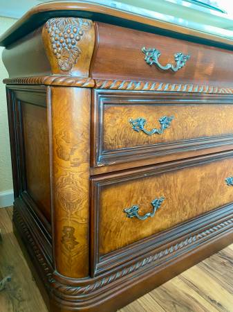 This is a heavy, well-constructed piece, not veneer-only or flat-pack furniture. The craftsmanship, carved details, and warm finish give it a true estate / heirloom look that elevates any space.