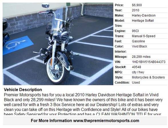 Premier Motorsports has for you a local 2010 Harley-Davidson Heritage Softail finished in classic Vivid Black with only 28,299 miles. We have known the previous owners of this bike, and it has been very well cared for throughout its life.