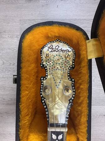 Built by Milton Burley in the 1970's. Stunning prewar Gibson fretboard with 1970’s Gibson Florentine reissue peghead. The pot is cast bronze, very heavy and gold plated. The resonator has gold glitter on the inner bowl and shines bright through the clear drum head. I cannot say for certain if the pot or resonator are original Gibson. I believe they are, as Milton Burley was tight with Julius Bellson at Gibson and sourced many rare and unusual Gibson parts from him. Please do your own research. Please view the pictures carefully,