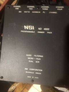 The dimmer packs are NSI ND 4600 (4 channel) 600 watts maximum per channel and have standard Edison grounded female plugs