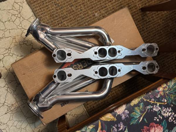 #CC10-158 sanderson silver ceramic coated. sbc fits vortex heads, A- body . brand new never installed. reducer flanges & bolts.
