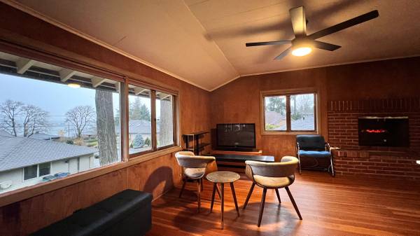 Studio amenities include a desk, queen bed, couch, mini fridge, portable heaters, TV, microwave, and river views. The loft runs cooler in fall/winter, and the electrical load is limited; we provide space heaters and will walk you through which outlets to use! House amenities include a beautiful vintage shared kitchen plus kitchenette basics in the unit, a 3/4 bath (shower, toilet, sink, mirror, and cabinets), a peaceful backyard, parking, and access to the walking path along Old Evergreen Highway overlooking the Columbia River.