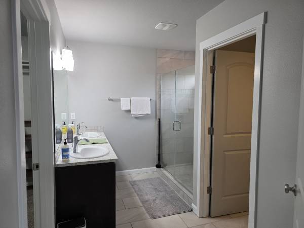 Available now, this is a furnished private room with its own bathroom and walk-in closet — together about three hundred ninety square feet of private space within a twenty-five-hundred-square-foot home near Vancouver Mall and I-two o five, roughly fifteen minutes from Portland. This is a six bedroom, three bathroom house with four occupied rooms.