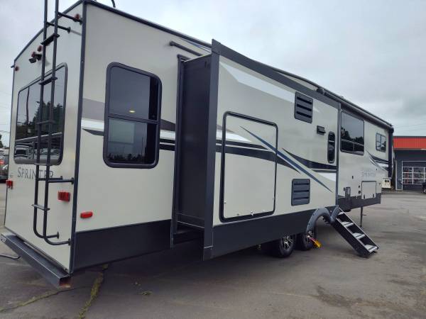 Comes with 2 Year Service Contract when purchased at the advertised price. 5th Wheel w/ Separate Bunk Room, Loft & Outside Kitchen Area. 4 Slides, Sleeps 8.