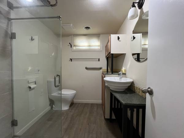 Both bedrooms are generously sized with vinyl plank floors and ample closet space. The first bedroom features built-in storage, while the second bedroom offers two entryways—one connecting to the living room and another leading to the hallway and bathroom. Both bedrooms feature egress windows looking out to a terraced outdoor enclosure. The bathroom has been tastefully updated with a contemporary bowl sink, linen storage, and a glass-enclosed step-in shower.