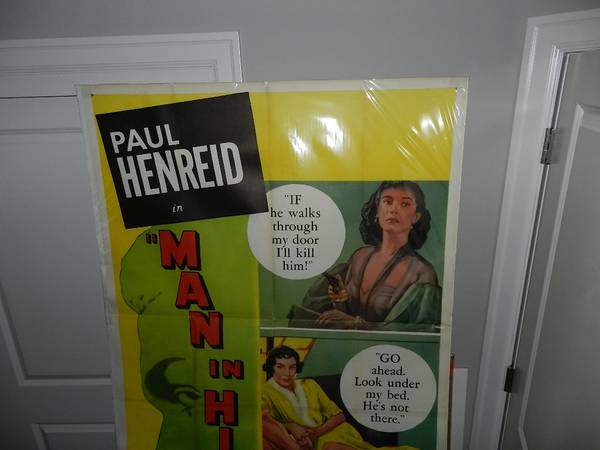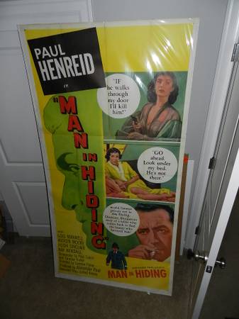 FOR SALE: 1953 Man in Hiding Movie Poster. This is a super large 2 sheet poster. Has been protected with shrink wrap on a foamboard backer. Plot: A wrongly convicted murderer escapes prison to find the real killer. His ex-wife, believing he seeks revenge hides under a new identity. Starring Paul Henreid, Lois Maxwell, and Kieron Moore. Director: Terence Fisher. Story origin....Based on the 1952 novel "Queen in Danger" by Trevor Dudley-Smith. It measure a very large 41 in. x 81 in. Price-$75.00. FIRM. NO OFFER. SERIOUS INQUIRIES ONLY PLEASE!!!