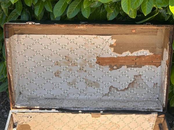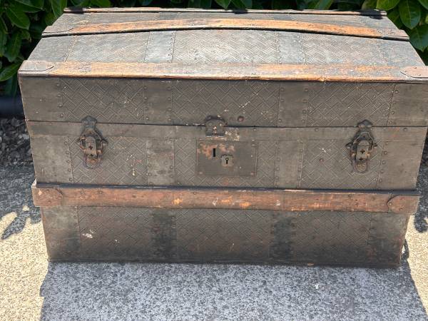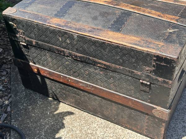 Old travel trunk likely from the late 1800s to early 1900s. Dome-top design with embossed metal exterior, wood slats, and original interior floral paper lining marked “Made in England.” Has small wheels on the bottom and partial leather straps (one missing).