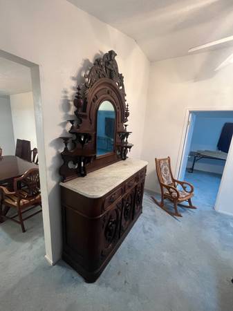 Antique Victorian Walnut buffet hutch. French European made old craftsmanship authentic furniture piece. Marble top. 8’5” tall x 60” wide x 20” deep.