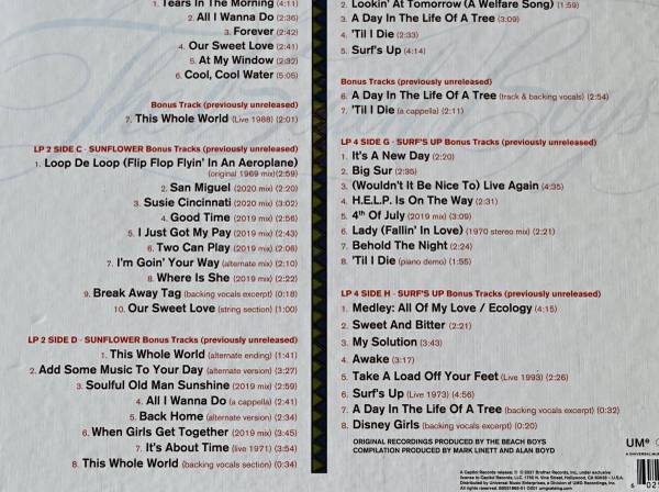 This is an amazing remastered remix of the albums SUNFLOWER and SURF'S UP - Along with studio track alternates, unissued songs and some stellar live performances like the whole band in a performance of Brian's masterwork song, Surfs Up. Includes is a 38 page booklet with the history of that post Pet Sounds era of the band band. This is the cheapest you will find this 4 record set in this condition. I write that with absolute honesty. This is an insanely great price.
