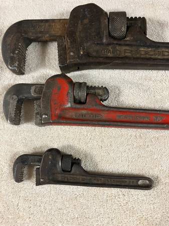 Three RIDGID Pipe Wrenches. If interested call and leave a message or text me at 5 zero three - 3 five 1 - 6 one 2 three. Bob