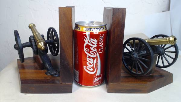 Nice looking bookends. From the 1960's. Cast iron canon with brass. Bookends are thick solid wood. Old State Farm plaque with fireman helmet on wood. This set weighs 5 lb 2 oz.