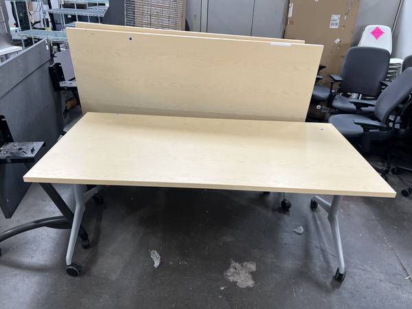 We have three large (6 foot) fold-up, nesting training tables in a light brown / cedar laminate color. Very versatile and easy to store when not in use.