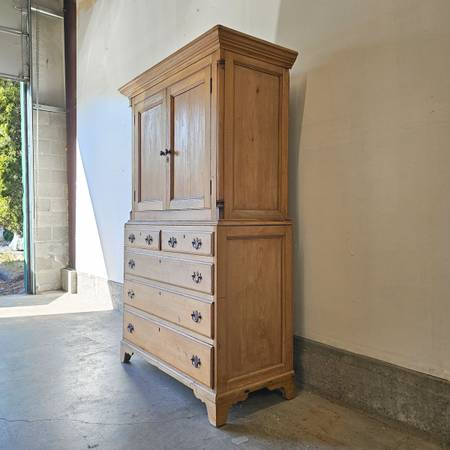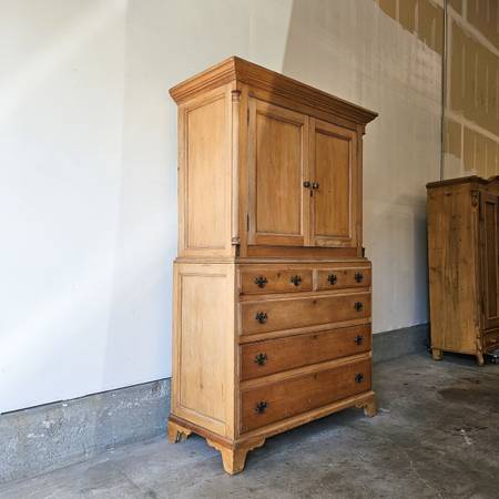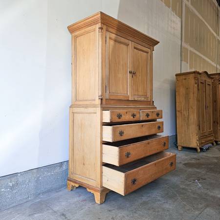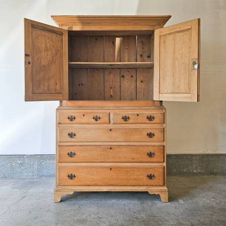 This handsome antique pine linen press offers both timeless style and practical storage. Crafted from solid pine with a warm, honey-toned finish, it features an upper cabinet with paneled doors that open to reveal two spacious shelves (not adjustable or removable), perfect for storing linens, clothing, or household essentials. Below, four deep drawers and two smaller top drawers provide ample additional storage, each adorned with ornate brass pulls and keyholes. The piece rests on bracket feet, adding to its classic silhouette. A versatile and functional addition to any bedroom, dining room, or hallway.