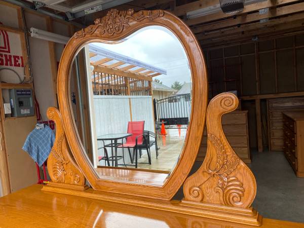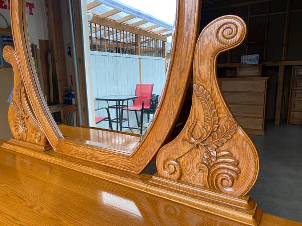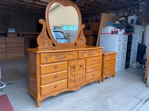 Beautiful 10 Drawers Solid Oak Wood Carved Dresser & Night stand, fresh wood stain outside ,Drawers glide smoothly , clean and in very great condition like new ! Made in USA. great condition...