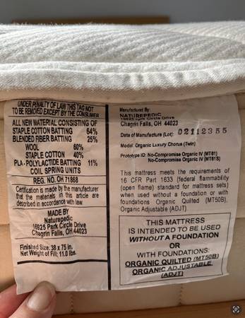 Naturepedic Organic Chorus Twin Mattress: 2 years old, in like-new condition. Made of hypoallergenic cotton and wool, no latex, glues or polyurethane. New at $1200, asking $650. See details here: https://www.naturepedic.com/chorus-organic-mattress-buy?466=1081