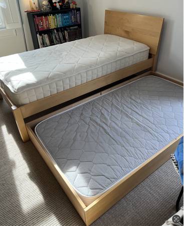 Room&Board Pogo Bed and Trundle: twin size, solid maple bed and headboard, includes maple trundle bed with mattress - great for sleepovers! Or trundle mattress can be removed, divider added for under-bed storage. Available at Room&Board for $2200 - asking $1400 if sold separately from Naturepedic Mattress.