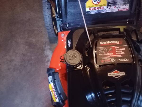 Yard Machines push mower powered by a Briggs & Stratton 675EX 190cc engine. 21” cutting width with side discharge and rear bagger.