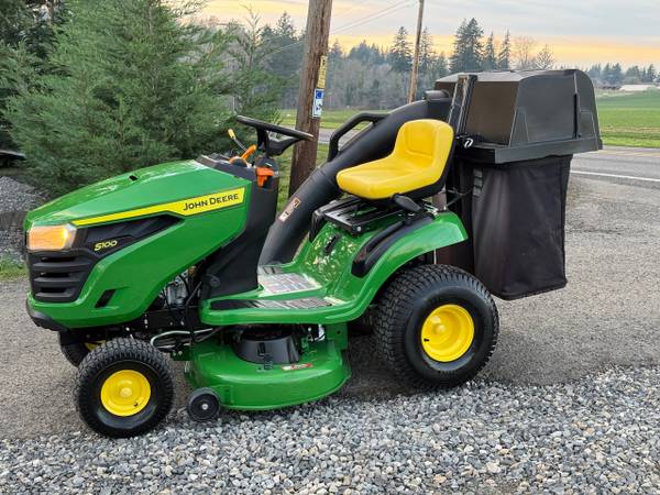 Like New John Deere S100 riding lawn tractor mower here for sale. Only 25hrs on the clock. Equipped with 42” 2 blade edge washout mow deck that is in like new shape. Same lawn tractor and bagger will run you $3100+ at dealers or retail and you have to set up the bagger yourself. This one is all setup and is ready for you to put it to work.