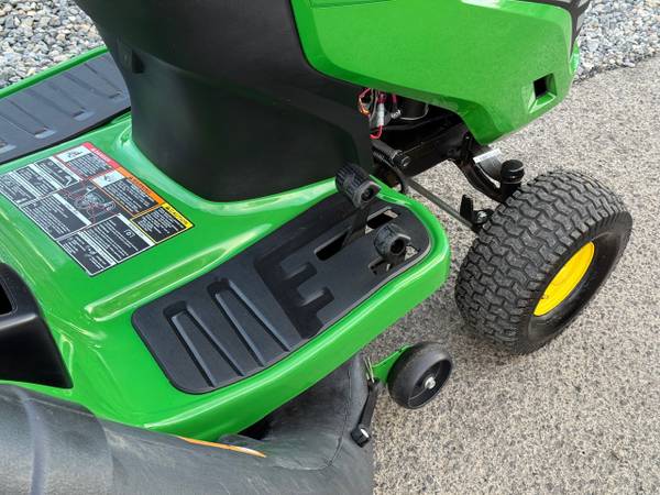 It is fully serviced and ready to cut your lawn. It has the John Deere Briggs and Stratton 17.5HP engine in it. Break in procedure is complete and just got a complete tune and service on it for new mowing season. New spark plug, front and rear tires in like new shape and all hold air great. Tires still have nubs on them. Mow deck is in excellent condition and is in like new shape. Setup with brand new John Deere bagging system and bagging blades. Deck Spindles are fully greased up as well as all moving components lubed up and ready to operate. It is fully automatic hydrostatic transmission that is foot operated with twin pedals. Very nice clear headlights, both bulbs work. Non ethanol clear premium gasoline is used in it so if you want it to run like a top then only use that. New fuel filter. Fresh Oil and new oil filter. New air filter. Deluxe seat, comfortable and adjustable. Has nice storage compartment that closes with a lid. Also has a cup holder. Fuel level gauge. New battery. Comes with main and spare keys.