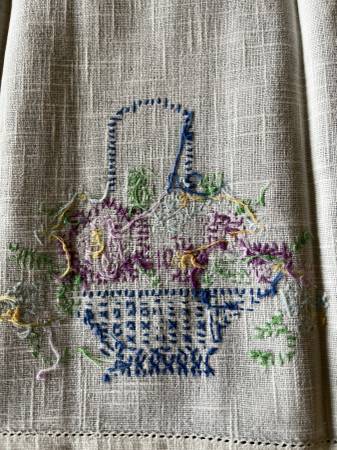 Vintage Pair Cross Stitched Embroidered Garden Flower Basket Tea Towel in EXCELLENT condition. Size is 14" x 18 1/2". Circa 1940's-1960's.