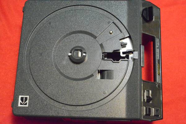 Kodak Medalist AF Carousel slide projector with zoom lens (C type, optimized for cardboard mounted slides; other lenses are available). Comes with wired remote. The Medalist is a Deluxe version of the Carousel model from Kodak with autofocus (focus the first slide manually and the AF will compensate for the variation in thickness/curvature of the subsequent ones) and this one is very clean.