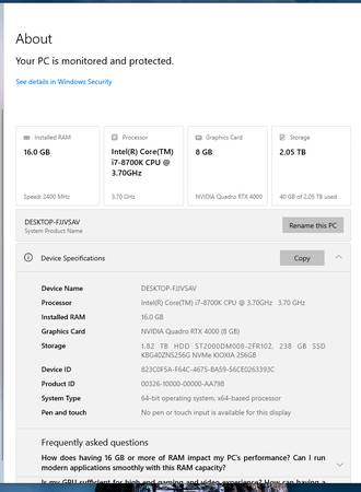 • Graphics Card: Nvidia RTX Quadro 4000 8 GB GDDR6 Memory VRAM