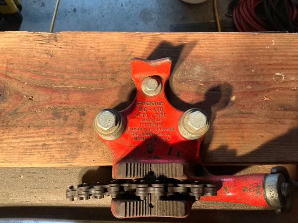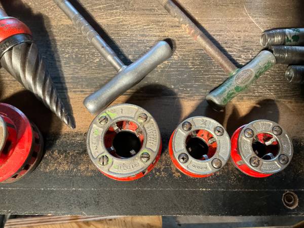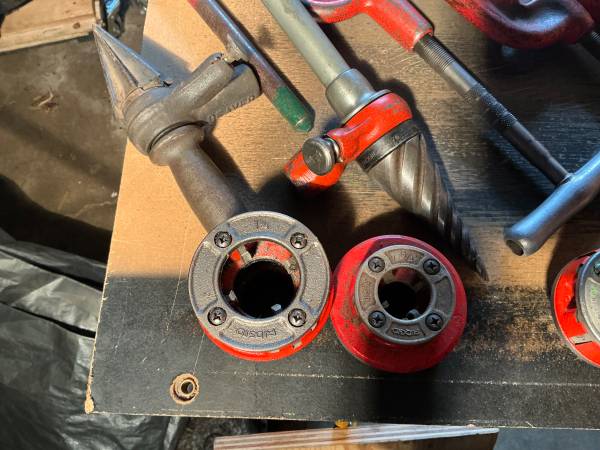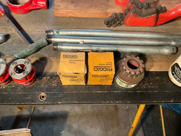 Ridgid pipe threading tools. Includes the following: a BC- 410 chain vice bolted to wood - I clamped it to a bench whenever I used it., a 12-R threading head with 1-1/4 and 3/4 inch dies, an 00-R threading head with 1/2, 3/4 and 1 inch dies, NOS 1/2 and 3/4 inch dies for a 111-R head as well as a used 1 inch die for one as well. These came with the set when I bought it, without the head. Also a D-476 reaming head for 2” pipe and an older Beaver reamer for 2-1/2” with its own short handle. There are 3 Ridgid handles, 16, 18 and 24 inch. The 24” was bent when I bought it, meant to straighten it out but never got to it. Two pipe cutters, a model 2 and a model 2A, good to 2-1/2” I think. Also a couple of containers of threading oil. Everything but the vice fits in a Kennedy toolbox and fits pretty nicely but it’s a workout for one man to carry. These are good quality tools and have served me well, I used them carefully and stored them inside always so there’s plenty of life left in them. I’m reducing duplicates and making some room in the shop. Phone calls only please, no calls after 5 PM thanks. I work out of town during the week so weekends are when they can be seen.