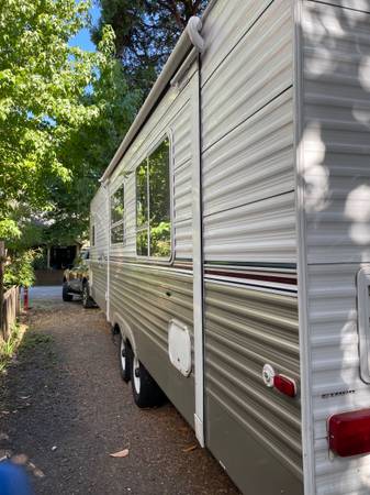 Springdale Keystone 2006 32-foot travel trailer from the Springdale line, known for being a good value and spacious floor plans. Features a full kitchen with a double sink, microwave, range and refrigerator, and a dinette that converts to a bed, and private master bedroom. This trailer includes a private bathroom with a tub, shower, and toilet. It has a great deal of storage. The many windows let in lots of natural light as well as letting the breeze flow through. Keep comfortable with air conditioning or heat. Power lift, comes with cover, many built in extras! Includes Jensen Stereo CD DVD Player, Samsung 32" TV in living room, Samsung 24" TV in bedroom, black out curtains, 12 ply tires, rear bumper receiver hitch for bike rack, LED strip wiring under-awning with remote, 2 large capacity propane tanks, new 30 amp trailer cord, new spare tire cover, extra storage built-in in bathroom and living room.