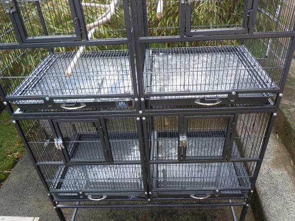 Bird cages, two stacked on stand, one stand alone. Each cage has a divider to make six total cages. Comes with lots of accessories. $50