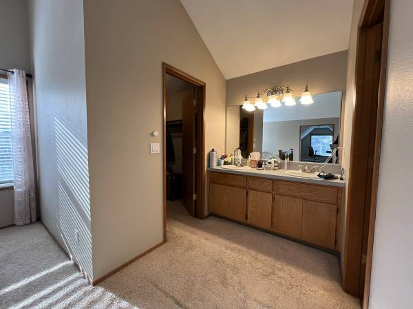 Upstairs, all three bedrooms and two full bathrooms are located on the second level, with carpeting throughout. The primary suite is expansive and features vaulted ceilings, a ceiling fan, and two tall windows that allow for abundant natural light. The suite includes a walk-in closet, a double vanity positioned between the closet and ensuite, and a private bathroom with a step-in shower. A unique bonus room with vaulted ceilings extends off the primary suite and is well suited for a home office, fitness space, or hobby room.