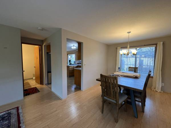 Upon entry, you are welcomed into the main living room, a spacious area featuring vinyl flooring and a charming bay window with a built-in sitting area—ideal for reading, relaxing, or display. Large windows fill the room with natural light, creating an open and welcoming atmosphere. At the far end of the space, a dedicated dining area comfortably accommodates guests and is well suited for entertaining.