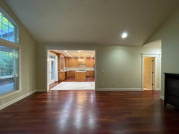 Just off the great room is your dining area and kitchen. Your new gourmet kitchen is fabulous with custom light hickory-colored wood cabinets, beautiful granite counters, and a large island with additional storage. Your new home has a refrigerator, dishwasher, stove/oven and a built in cabinet microwave. The recessed lighting and french doors off the dining area provide additional great lighting. A large covered patio is just outside the french doors offering you an outdoor living area with shelter from the PNW climate. Access your mudroom/laundry area just off the kitchen.