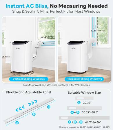 ใ๐๐จ๐จ๐ฅ-๐ ๐ซ๐๐ ๐๐๐ญ๐ฎ๐ฉ ๐ข๐ง ๐ ๐๐ญ๐๐ฉ๐ฌใInstall this portable air conditioner for rooms in minutes: Attach the exhaust hose, secure the adjustable window bracket, and plug it in. No drilling requiredโideal for most vertical windows & horizontal windows (20.39"-57.16")