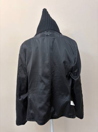 Elevate your cold-weather style with this chic and high-quality jacket from THEORY. This cropped peacoat features a stylish black/charcoal plaid pattern and a unique, cozy ribbed knit collar that stands up nicely. It's perfect for adding a touch of sophisticated structure to any outfit.
