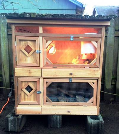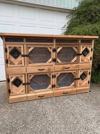 2-Level Cedar Rabbit Hutches built by local craftsman using all new materials. Several sizes available. The hutches have removable dividers between the nesting area and the open area. The top lids are hinged so they open up to access the inside. All hutches feature pull out poop trays for easy cleaning. Built to withstand the weather outdoors unlike the cheapo ones in the pet/farm stores.