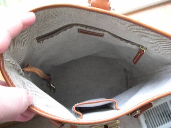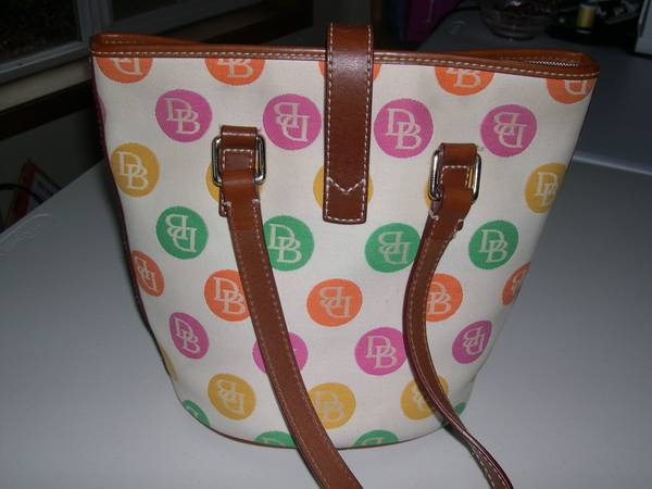 Gently used D&B bucket bag. Background is beige fabric with colorful bubbles featuring the D&B logo. Features one zip pocket and one cell phone pocket in the interior. Also has an attached key keeper.