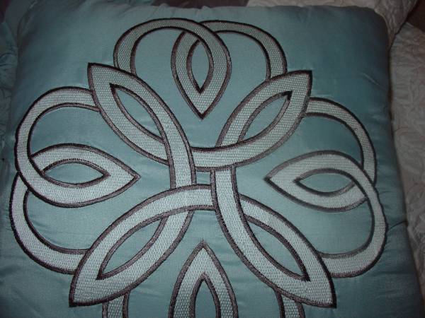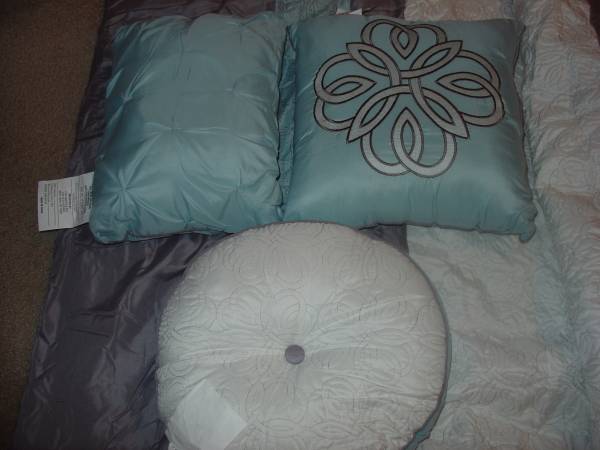 KING SIZE COMFORTER WITH EXTRAS. COMES IN ZIPPED CLEAR BAG - INCLUDES: COMFORTER, MATCHING 3 DECORATIVE BED PILLOWS(2 ARE REVERSIBLE - SEE PHOTOS), 2 PILLOW SHAMS AND A BED SKIRT. ALL MATCHING. MADE OF 100% POLYESTER, MACHINE WASHABLE. COMFORTER SIZE IS 104" X 90". PILLOWS RANGE FROM 10-15". VERY NICE SET. MAKES A GREAT GIFT! ALL IN EXCELLENT CONDITION. SEE PHOTOS.
