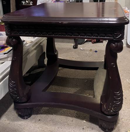 Intricate leaf and flower carvings. Sturdy solid wood construction. Rich, dark wood finish. Dimensions: 28" x 28" x 27". Elegant, classic design. Normal wear and tear and a couple noticeable drink rings on surface. Pick up next to Fred Meyer on Walker and 158th. No problem with contactless exchange.