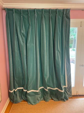 Green velvet drapes with rod and rings