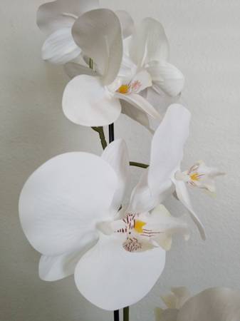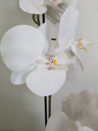 Silk white, 10 blooms, white Orchid in potted vase with stones. Flowers from base 22" h x 12" w. Vase, glass 5.5" h x 6" w. You pick up. Response through craigslist app only! Cash.