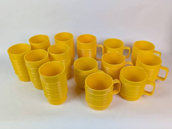 I am selling a large, 14-piece set of vintage Rubbermaid stacking drinkware in bright harvest yellow. These are the classic, durable plastic cups from the 70s/80s with the ribbed design. They are lightweight, virtually unbreakable, and stack perfectly to save space. Includes one Rare Tall Handled Mug.