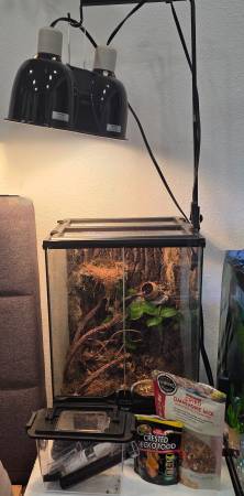 This is a two month old live Vivarium with isopods and springtails. 12x12x18 - exo terra brand. Come with a full setup for your new pet! -Light Stand -Dome with included bulbs -Cricket cage -2 bags...