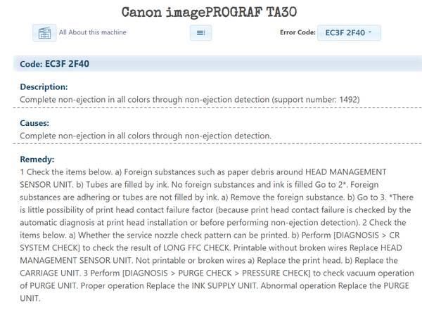 I am not a service tech but it seems like these error codes indicate that a head management sensor unit needs replacing. I included photos of error codes description, causes, and remedy.