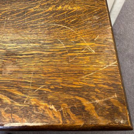 Flawed Mid Century Quarter Sawn Wooden Square End Table is in pre owned condition with visible scratches, wear, and surface blemishes; good candidate for refinishing.
